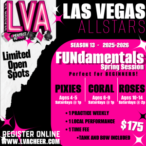 Las Vegas All Stars is the #1 D2 Cheerleading program in Nevada! At LVA our goal is to build self-confidence, teach teamwork, accountability and hard work. When you put all those together you create this amazing environment we have at Las Vegas All Stars! Come be a part of something special today!